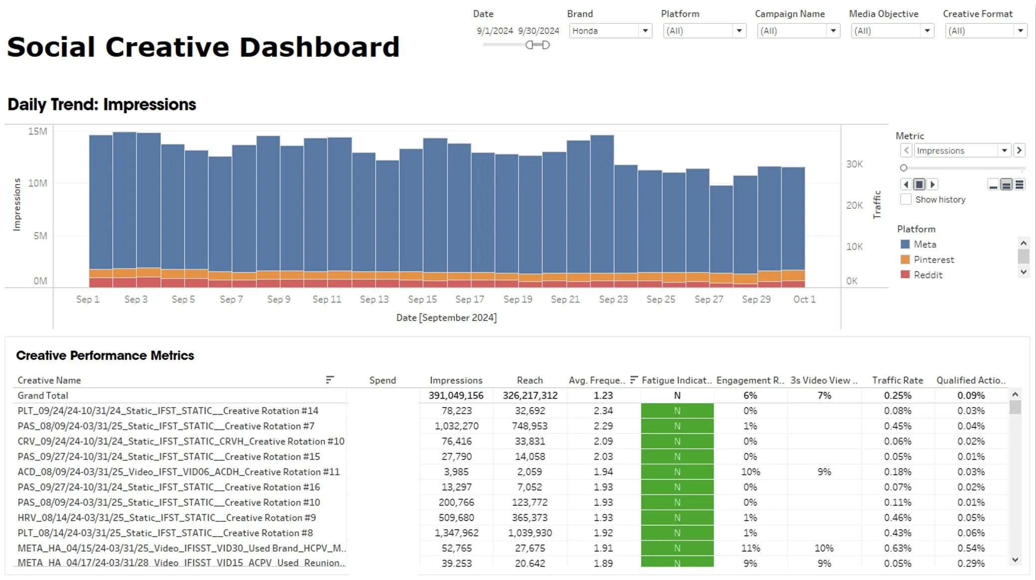 Develop a dashboard that quickly, and easily shows raw creative data and potential media fatigue from multiple social platforms.